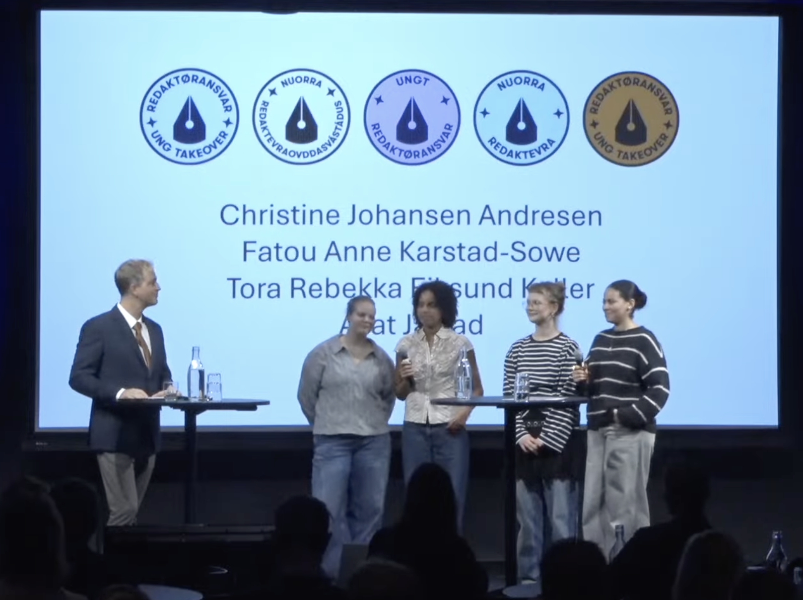 F21s Tora, Fatou, Kristine og Ayat deltok på Norges Redaktørforenings høstmøte, som representanter for dagens unge. Elevene var på scenen og ble intervjuet om hva de ville endret hvis de fikk være redaktører og hvorfor det er så viktig å nå ut til unge.